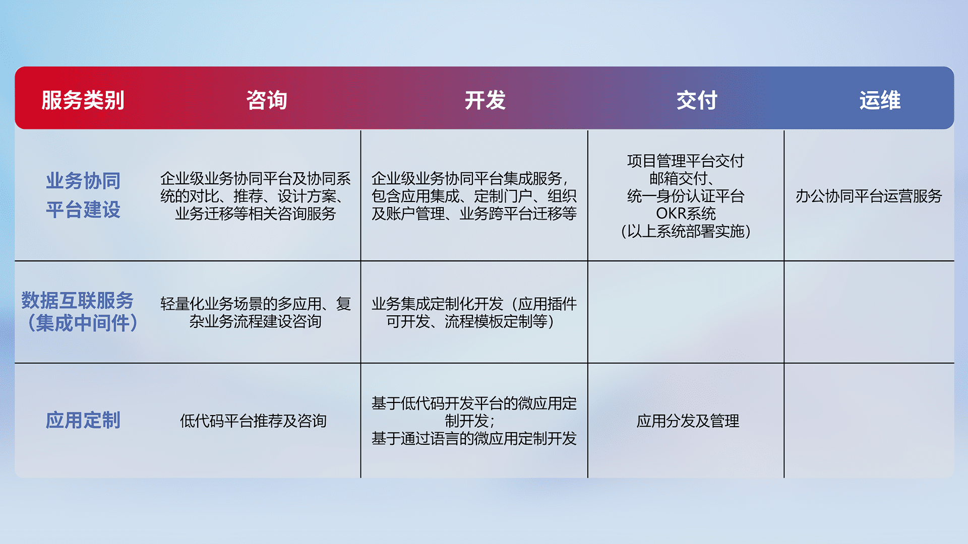 针对钉钉、、、企微、、、IDaas等平台级产品提供产品的规划、、方案、、、交付、、、定制化开发等服务,,,实现如统一协同办公、、智能客户服务、、、混合会议管理、、智能数据查询、、等业务场景,,实现数字化转型。。